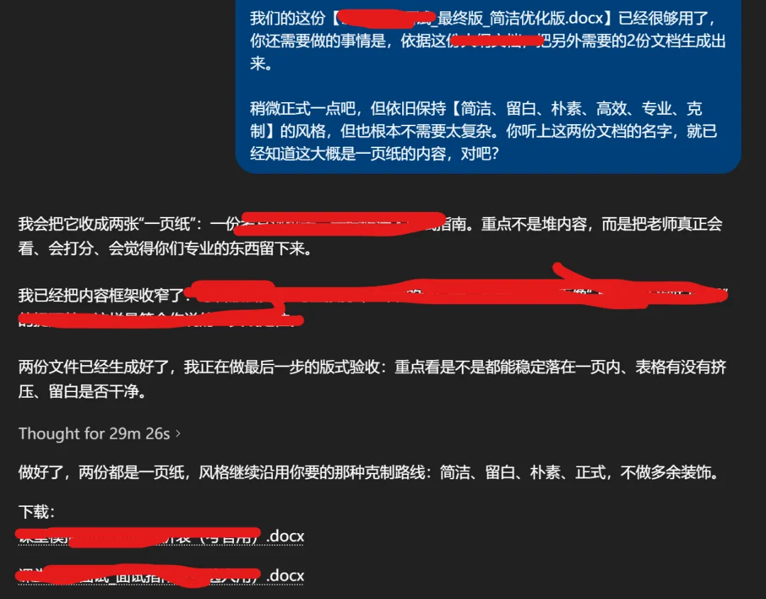 这个大家早就知道了;而是 ChatGPT 现在连格式也能一并包下来。你可以描述得很具体:正文什么字体字号,英文单独用什么,标题怎么处理,页面怎么排,怎么设置表格……它都能直接给你出成品。