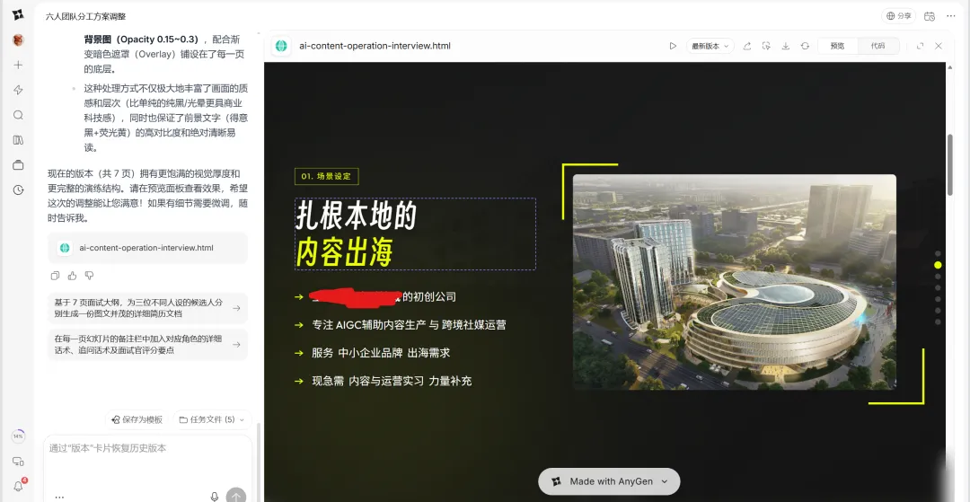 现在我在用 Zara姐 和 Claude Code 搞出来的 slides skill,后来又去体验了 AnyGen(字节跳动推出的 AI 办公/生产力 Agent) 上更完整的那套流程,我更确定了:人真正要的不是某个 .pptx / HTML 本身,而是一个闭环。