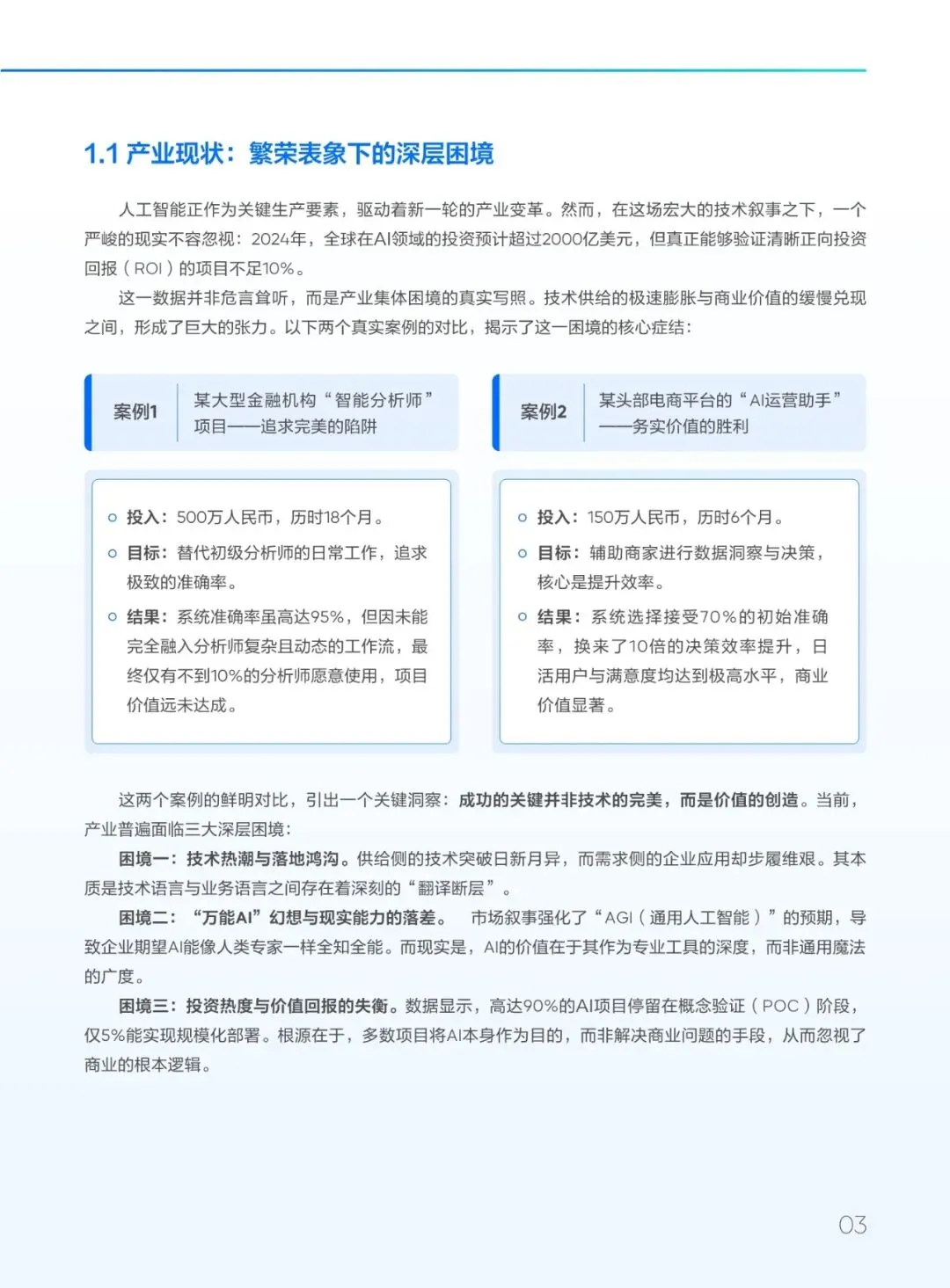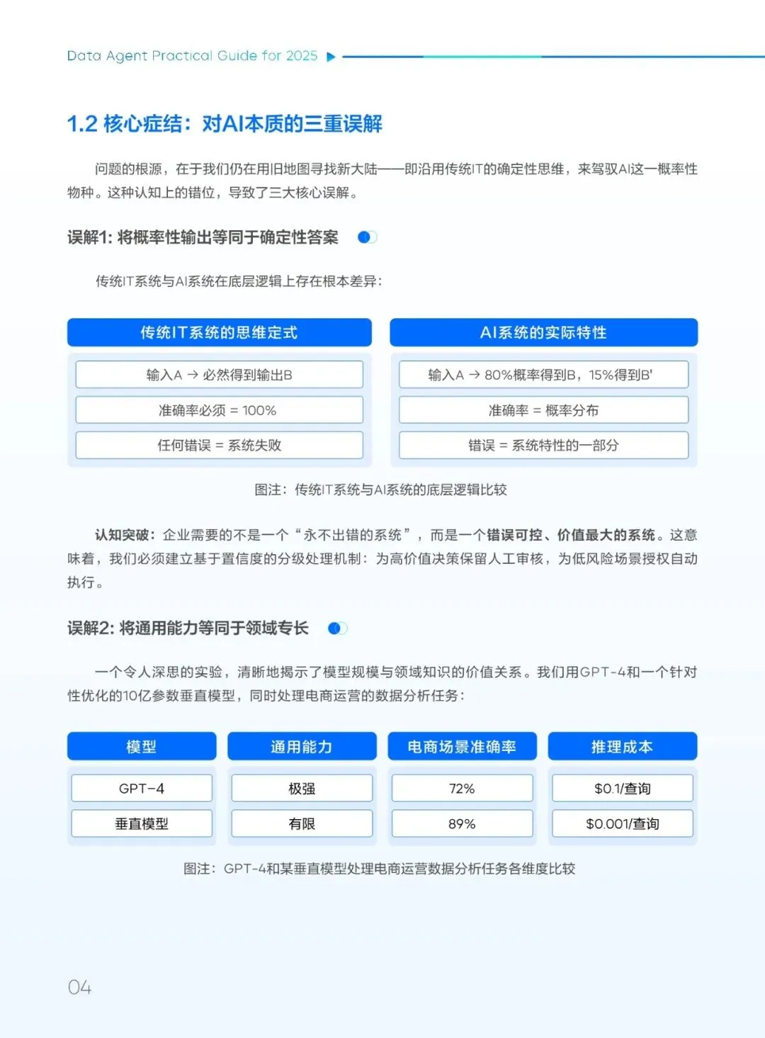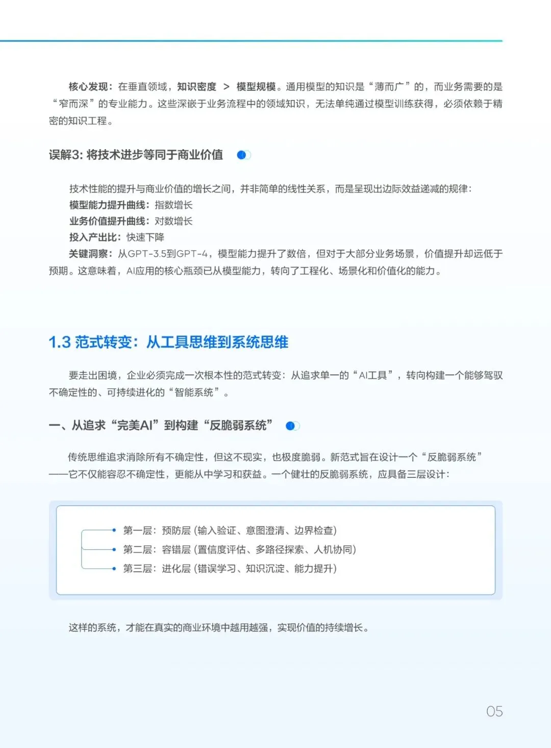 指南首先指出,当前AI产业面临“技术繁荣、价值滞后”的困境:尽管全球AI投资高涨,但多数项目难以实现规模化落地与明确回报。其根源在于对AI本质的三重误解:将概率性输出误作确定性答案、将通用能力等同于领域专长、将技术进步直接等同于商业价值。为此,企业亟需完成三大范式转变:从工具思维到系统思维、从追求完美AI到构建“反脆弱系统”、从技术驱动转向价值驱动。