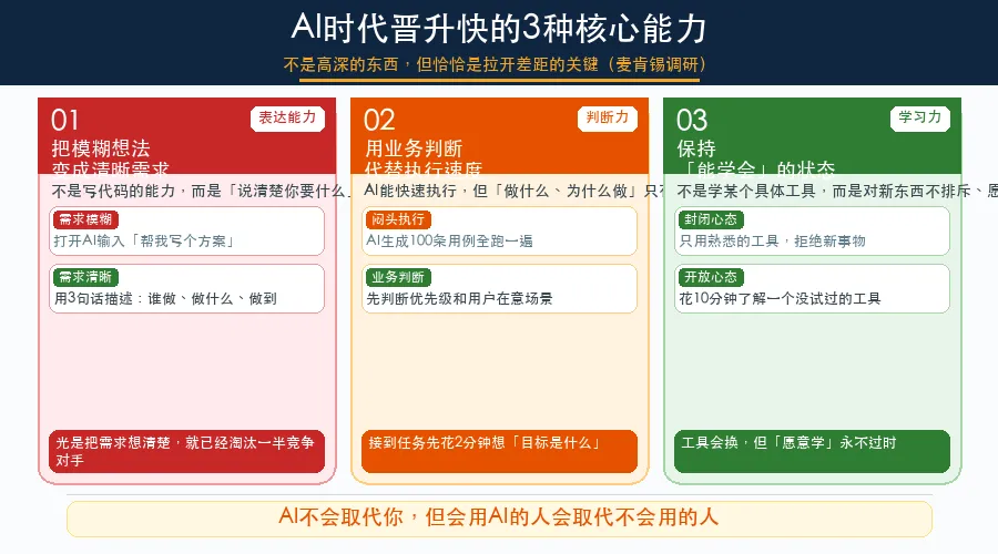 麦肯锡2023-2025年AI素养需求增长7倍,3种核心能力+今天就能做的微行动,职场人AI转型从提问开始。