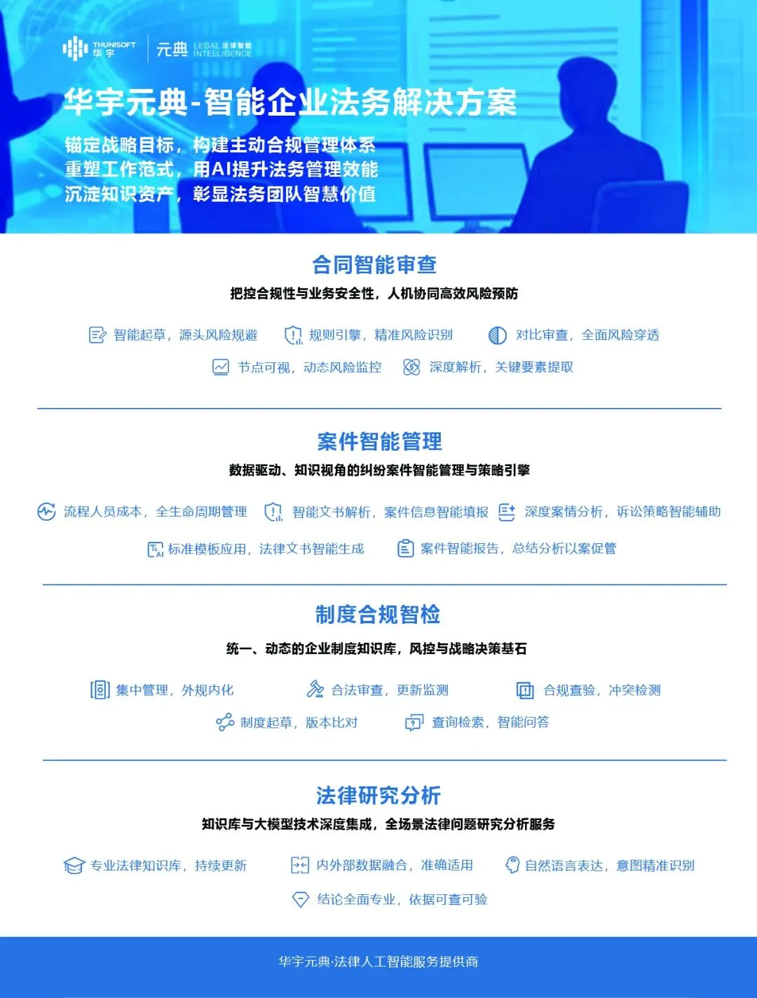 总体来看,企业法务的智能化转型,本质上并不是一场”技术替代”的变革,而是一场”价值升级”的进化。当AI深度融入制度建设、合同管理、案件处理与法律研究的每一个环节,人机协同将释放出更高效、更精准的法务能力,推动法务部门从被动响应走向主动治理,最终成为支撑企业稳健发展与高质量增长的关键战略引擎。华宇元典将积极响应行业号召,持续推进技术创新与生态共建,以AI力量重构企业法务新范式,为法治社会建设注入科技动能,携手行业伙伴共同开创法律科技的美好未来。