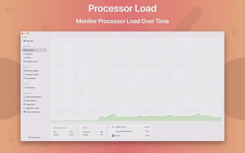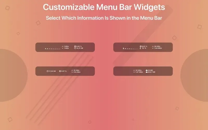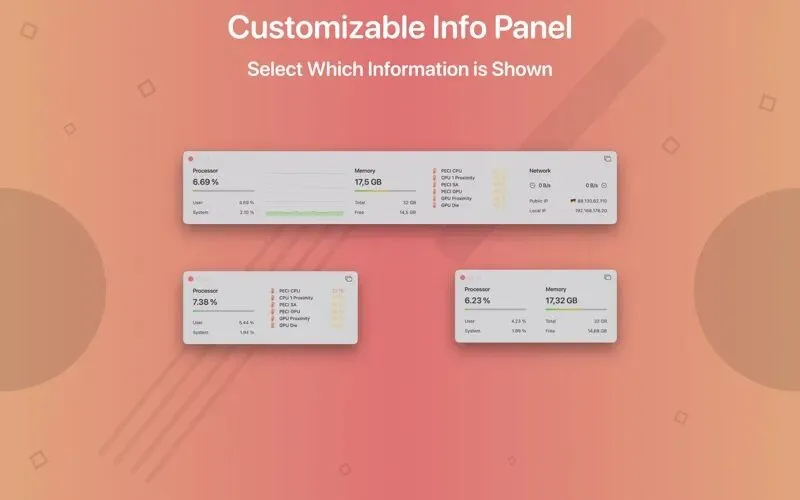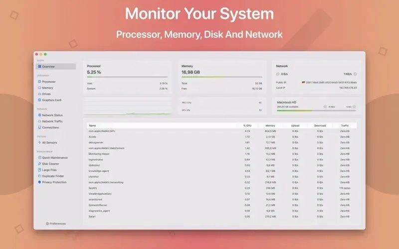 System Toolkit 的核心优势在于其灵活且全面的系统监控能力。它不仅能实时追踪 CPU 负载、内存使用率、网络上传下载速度及流量,还能显示活跃的网络连接。这些信息并非局限于单一窗口,而是可以通过菜单栏小部件、独立的信息面板以及置顶的覆盖窗口三种方式呈现。这意味着,即使你在全屏运行游戏或专业软件,覆盖窗口也能让你在不切换界面的情况下,持续关注系统资源占用情况,对于视频渲染、大型编译或网络调试等需要监控后台资源消耗的场景尤为实用。