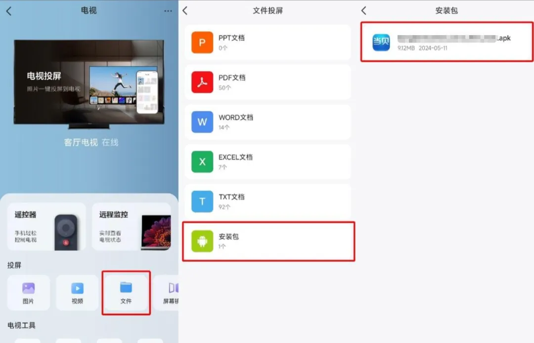 五、在海信爱家首页点击对应的电视,在投屏一栏选择文件-APK,选择apk结尾的文件。