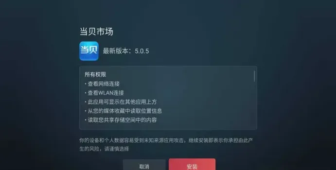 六、等待安装包传输完成后,电视会弹窗提示是否安装,选择安装,点击安装即可顺利安装【当贝市场】。