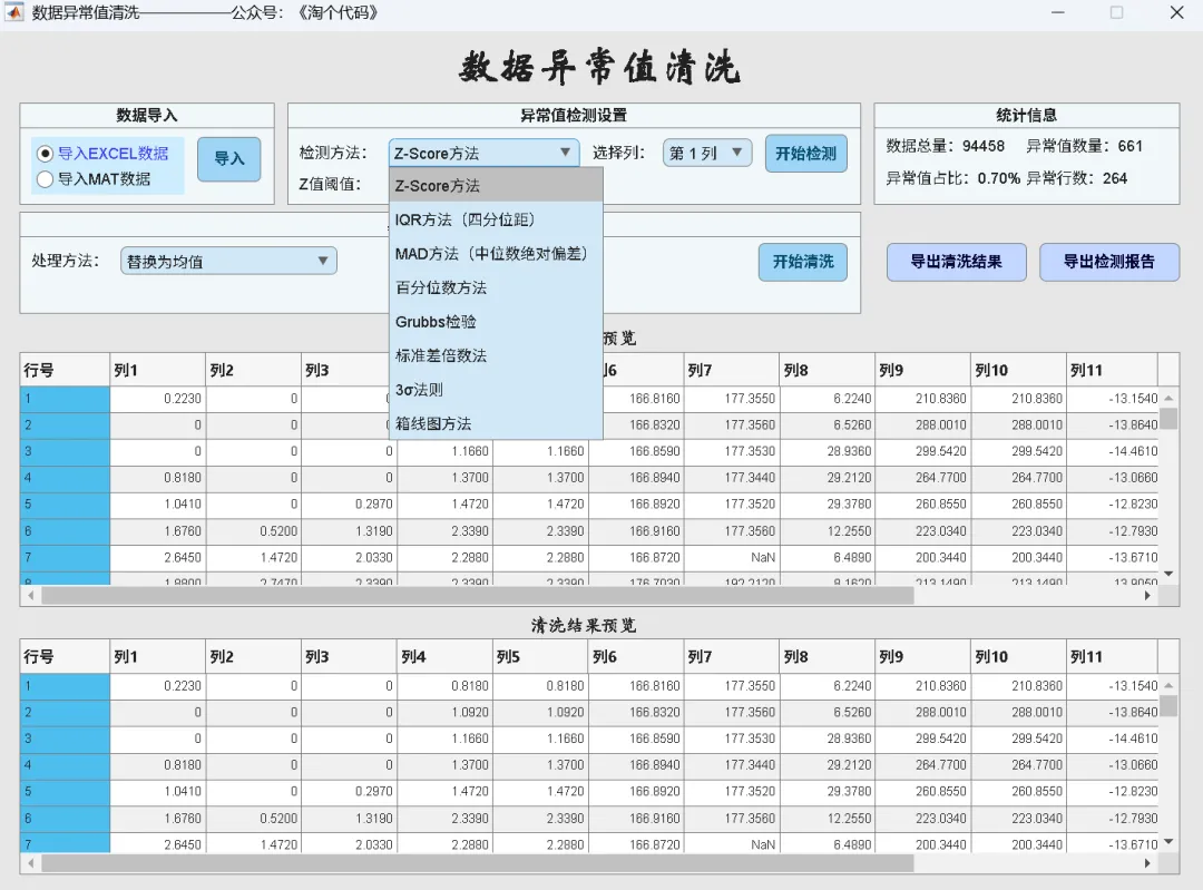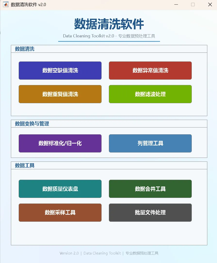 数据清洗软件 v2.0 是一款基于 MATLAB App Designer 开发的桌面端数据预处理工具,提供可视化图形界面。数据清洗软件 v2.0 集成了 10 大功能模块,覆盖数据预处理全流程:
