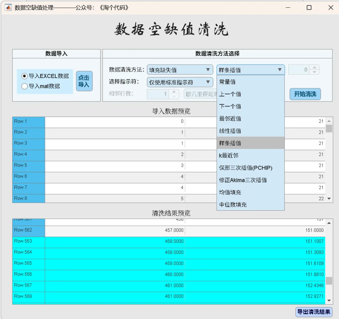 空缺值清洗:支持删除行、固定值/统计量填充、多种插值,可自定义列范围。