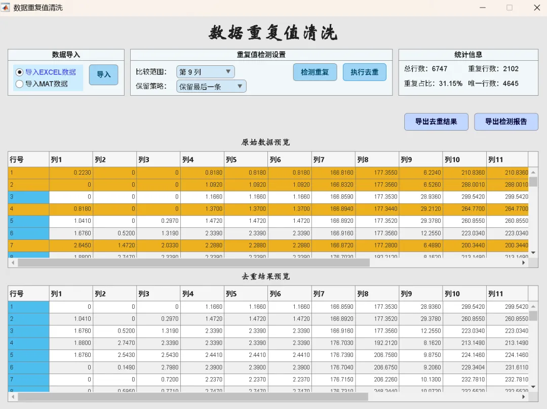 重复行高亮显示,统计面板展示总行数、重复数量、重复占比、去重后行数 -