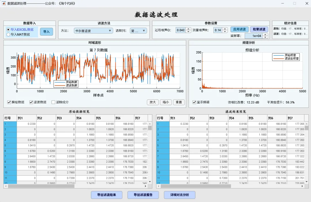数据滤波:内置移动平均、巴特沃斯、FIR、中值、Savitzky-Golay、小波去噪、高斯滤波共 7 种滤波器,含波形对比、频谱分析和质量指标。