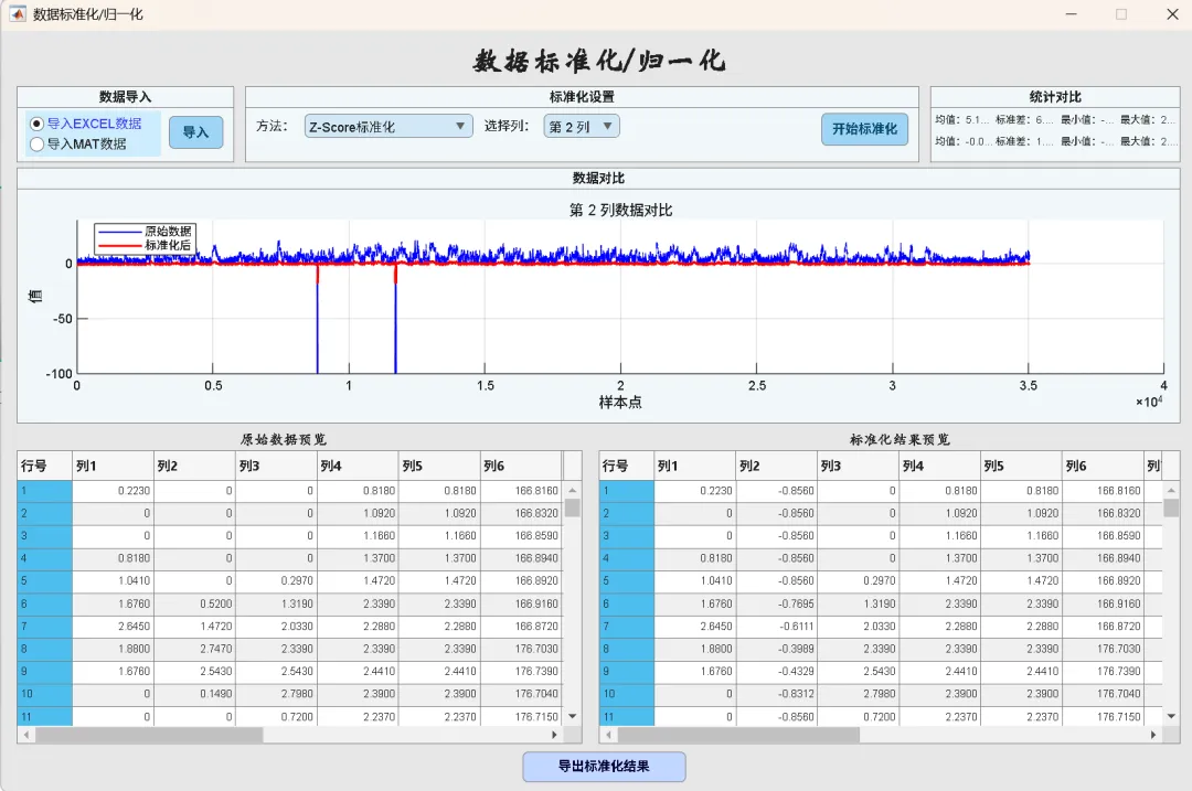 支持选择处理单列或全部列,提供变换前后统计对比(均值、标准差、最值)和可视化对比图表。