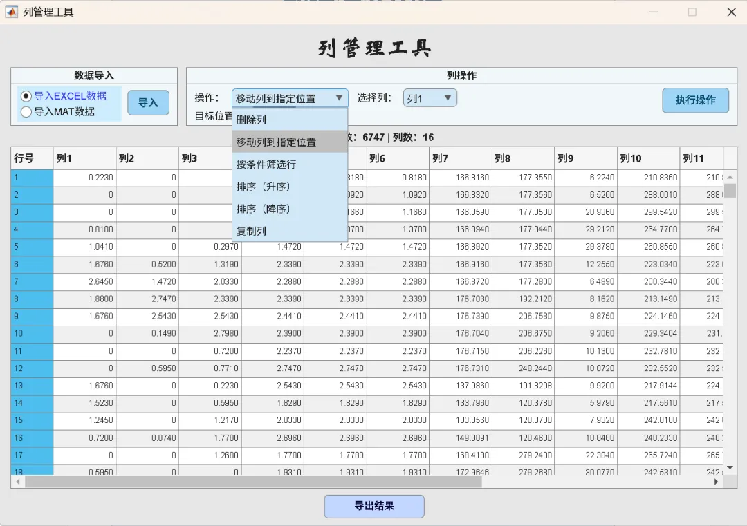列管理工具:可删除、移动、复制、排序列,并支持按条件筛选行(>, <, == 等 6 种)。