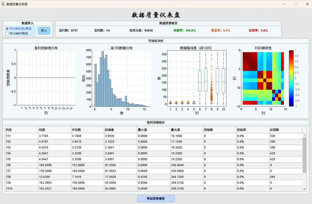 数据质量仪表盘:一键生成数据完整率、重复/异常比例、缺失值分布、直方图、箱线图、相关性热力图及逐列统计报告。