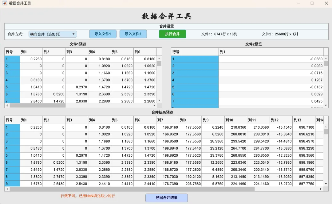 数据合并:支持纵向(追加行)与横向(追加列)拼接,行/列数不齐时自动补 NaN,可预览与多格式导出。
