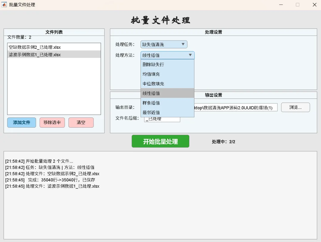 批量文件处理:可对多文件统一执行缺失值、异常值、滤波、标准化、去重操作,自定义输出目录并汇总成功/失败数。