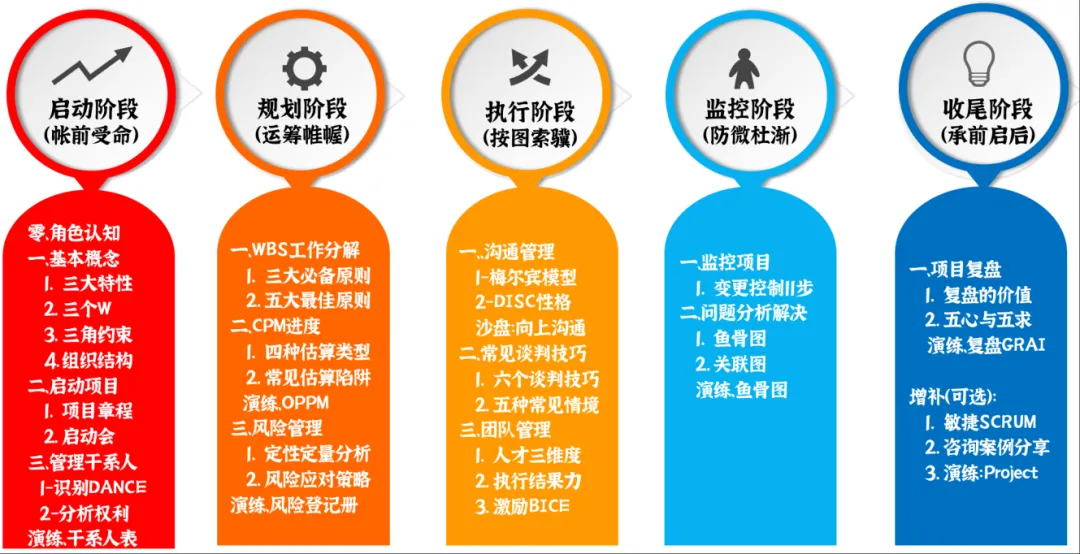 本课程将以项目管理五大过程为主线,通过讲师多年授课和项目实践经验进行讲解,同时分享丰富的经典案例并剖析原因,深入浅出的引领学员结合自身实际工作进行案例演练,从而让学员深入理解项目管理的核心理念与思想。