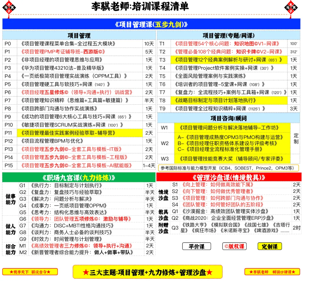 通过本课程的学习,可以帮助企业和学员通过建立项目管理思维,统一目标管理,运用项目管理工具,科学地指导实际工作、提升工作绩效,为企业的高效管理和高绩效助力。