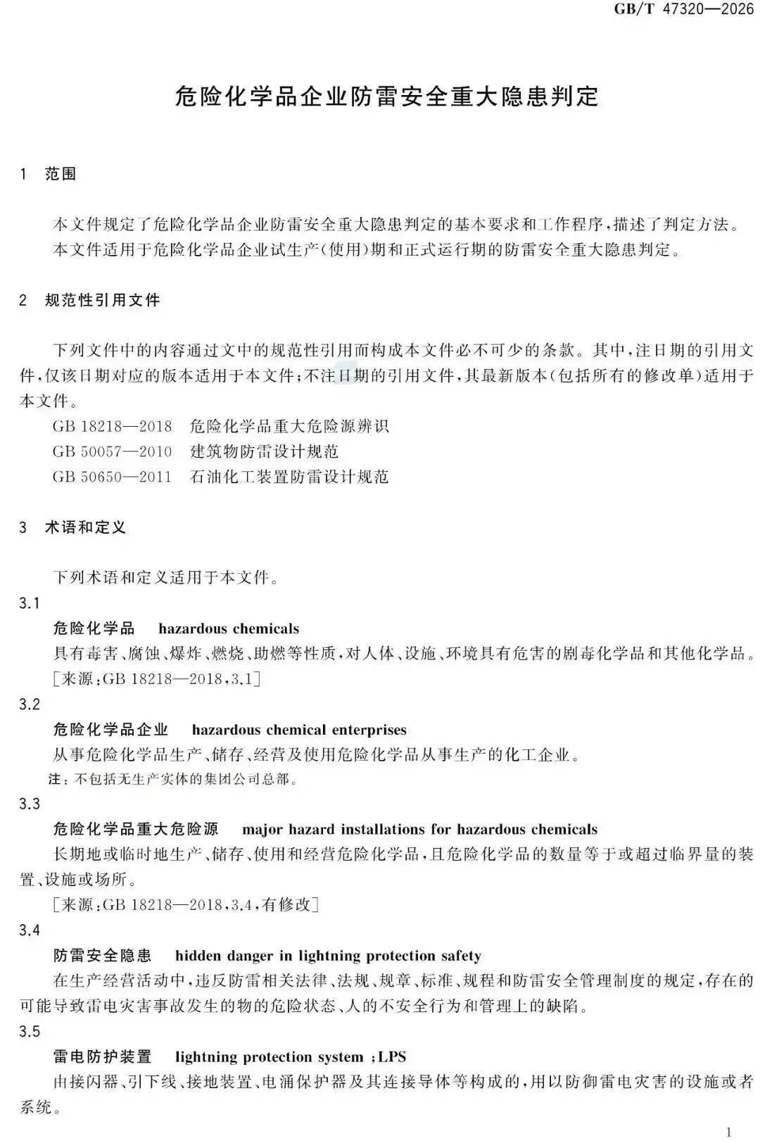 可下载!GB/T 47320-2026危险化学品企业防雷安全重大隐患判定