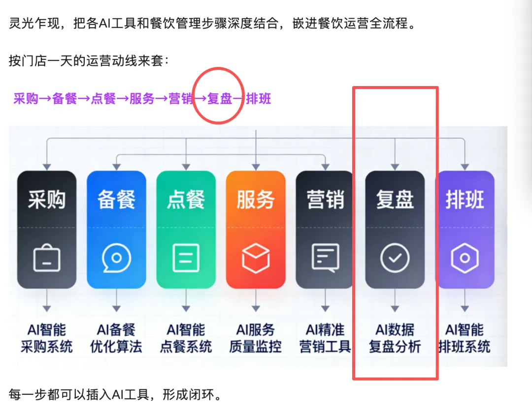 接上,我们讲了要把各AI工具和餐饮管理步骤深度结合,嵌进餐饮运营全流程。按门店一天的运营动线今天聊:AI数据复盘