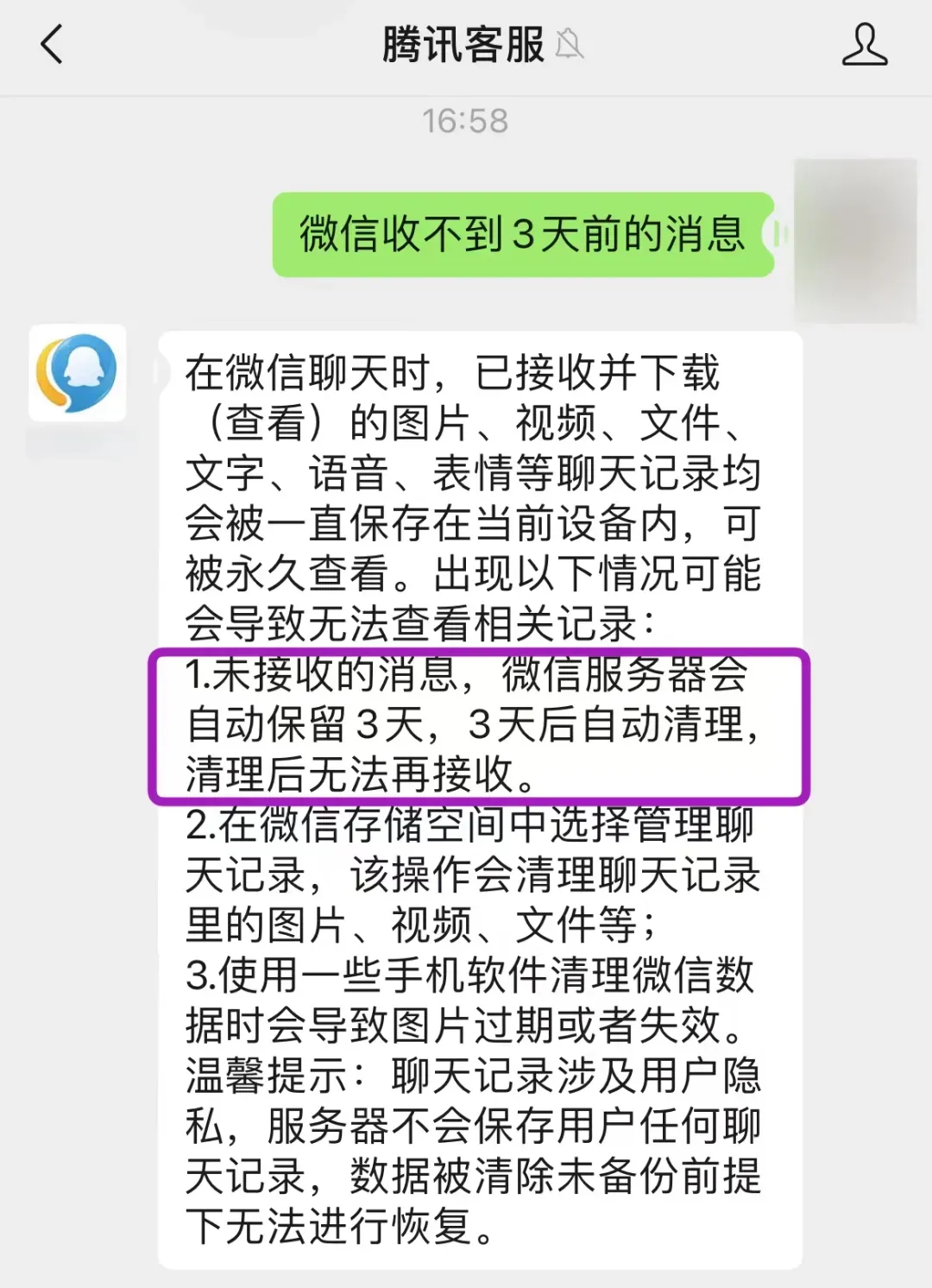 当时的官方回应是:未接收的消息,微信服务器会自动保留3天,3天后自动清理,清理后无法再接收。