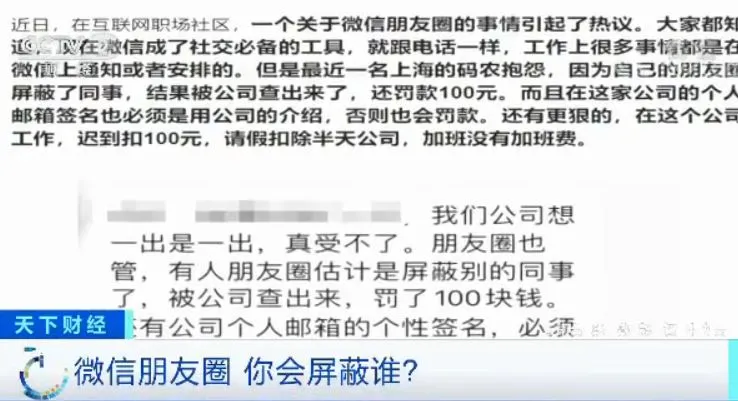 近日,一个关于微信朋友圈的事引起了热议,有人的朋友圈屏蔽了其他同事,公司查出来后罚了100元。听闻此事,社会各界意见不一。