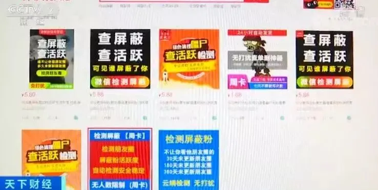 针对朋友圈屏蔽的服务在网络上也很火热,记者在某网购平台输入关键字“微信 屏蔽”,立马跳出了上百个网店链接,查屏蔽、查活跃、绿色清理僵尸粉等字眼特别显眼,成交量最高的一家网店,月销量有5000多笔。