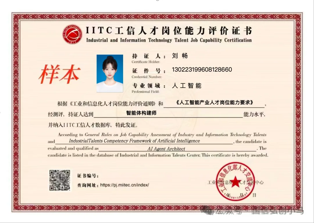 完成培训后,学员可参加由工信部人才交流中心组织的线上能力测评。测评每年举行6次,形式包括单选、多选、判断和简答题,并采用人脸识别等防作弊功能。经测评合格者,将获得由工业和信息化部人才交流中心颁发的《智能体构建师》IITC工信人才岗位能力评价证书,该证书可在官网查询验证。此证书不仅证明持证者具备相应的专业能力,其评价结果还可作为企事业单位招聘、晋升、定薪的参考,并且该人才服务项目未来还将与主流招聘平台合作,为学员开辟专属求职通道,实现从“能力培养”到“岗位对接”的一站式服务。