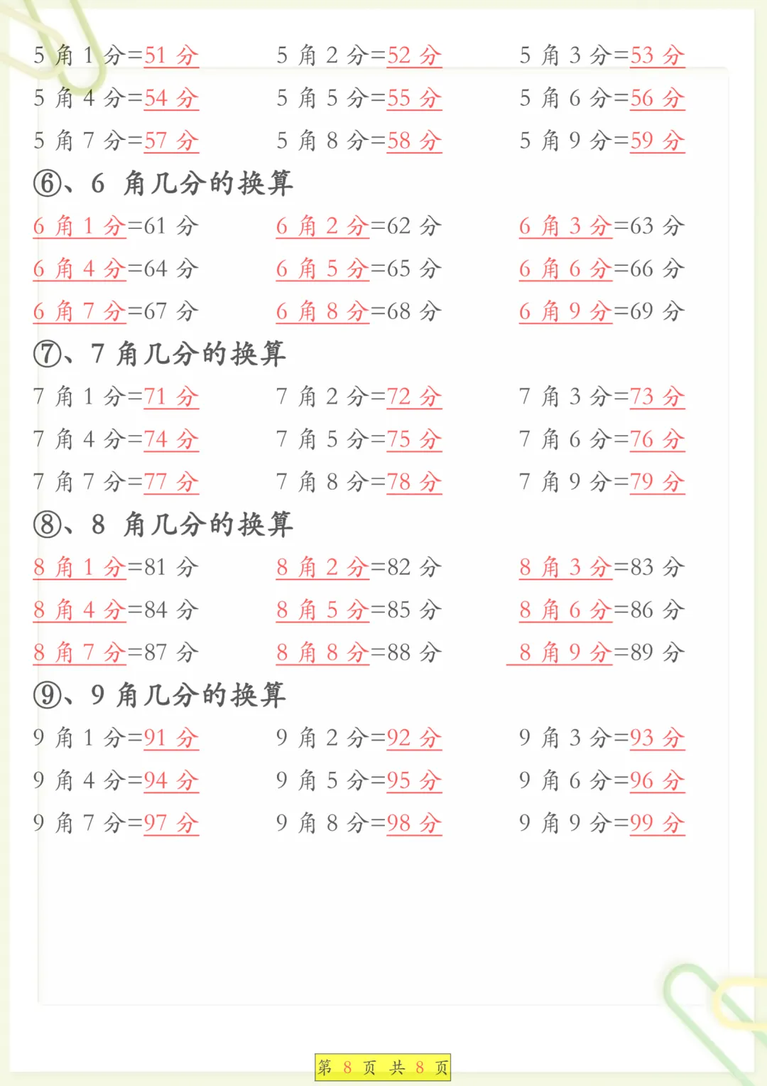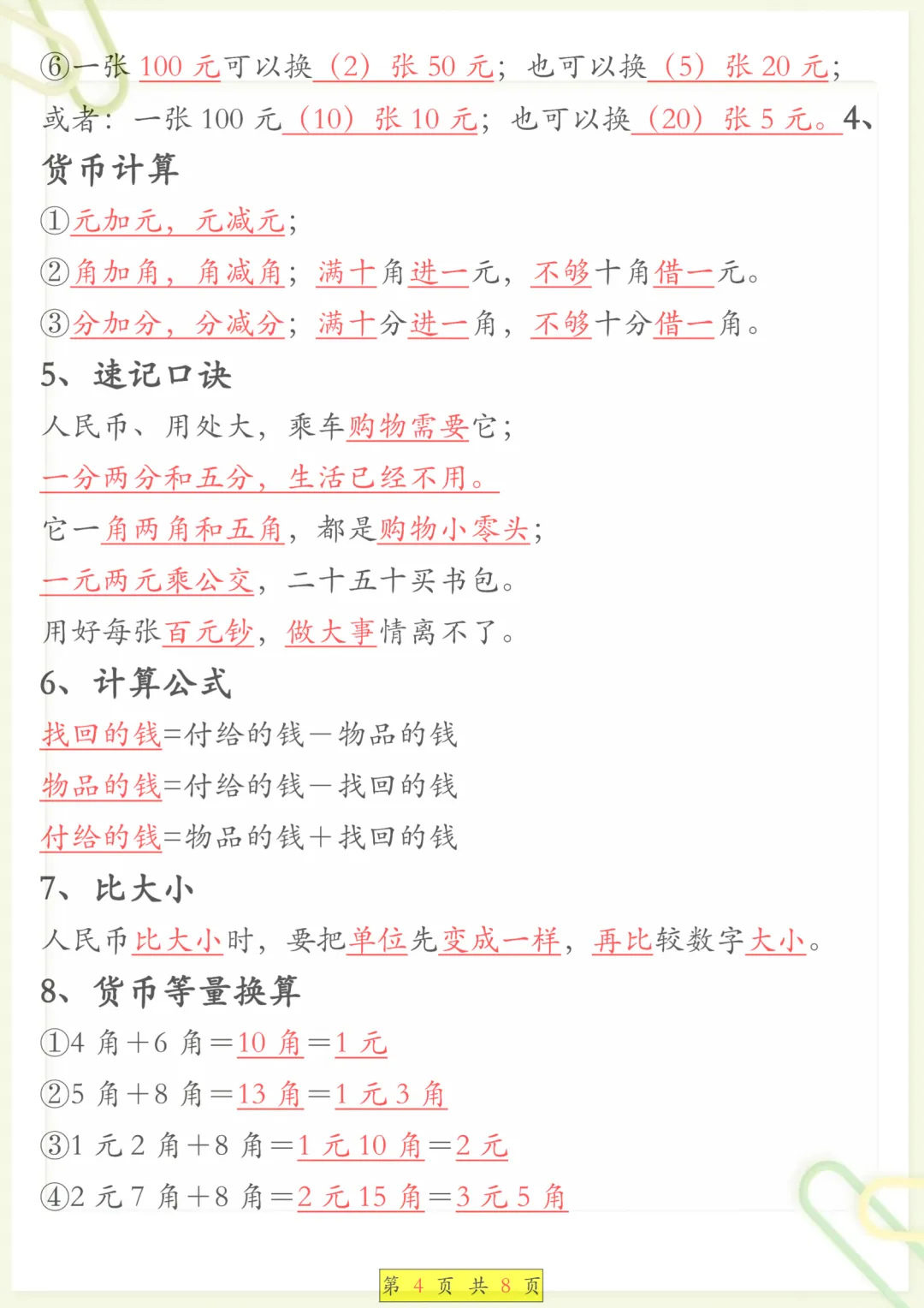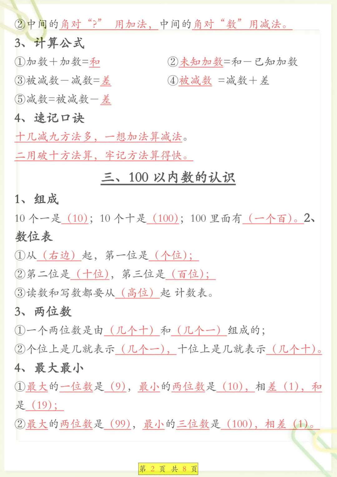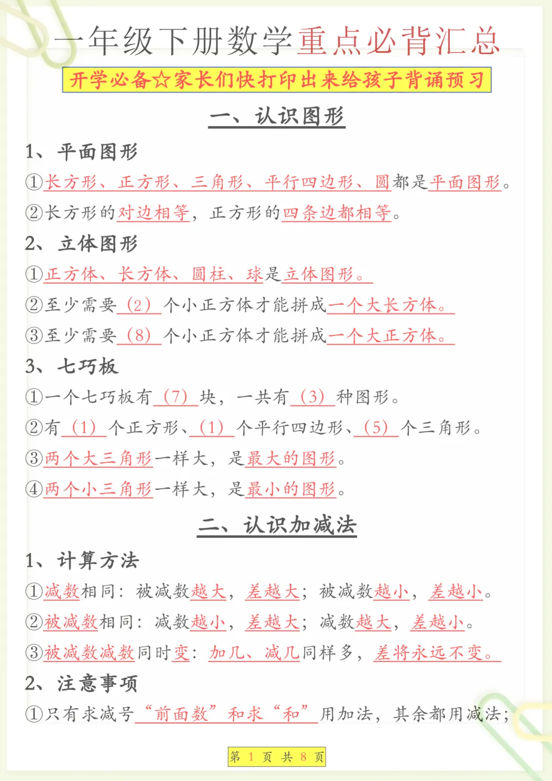 一年级下数学全册知识点汇总,共8页,电子版可下载可打印,这份资料围绕一年级下册数学学习内容进行系统整理,涵盖多个核心知识点与专项训练内容,便于孩子在课后复习、查漏补缺,也方便家长快速把握本册学习重点。内容精炼实用,适合日常巩固和考前梳理,需要的家长可以及时保存打印出来,让孩子练一练、记一记。