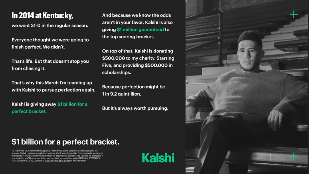 Kalshi 与 NBA 球星 Devin Booker 合作的「10亿美元完美夺冠预测挑战」,就是最好的案例: