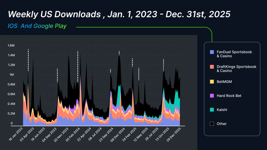 Sensor Tower 2023-2025 年的数据显示,体育博彩与预测类 App 的用户,全年都保持着一定的参与度:休赛期的选秀、球员交易、重大体育新闻等事件,都在持续强化用户的 App 内行为。