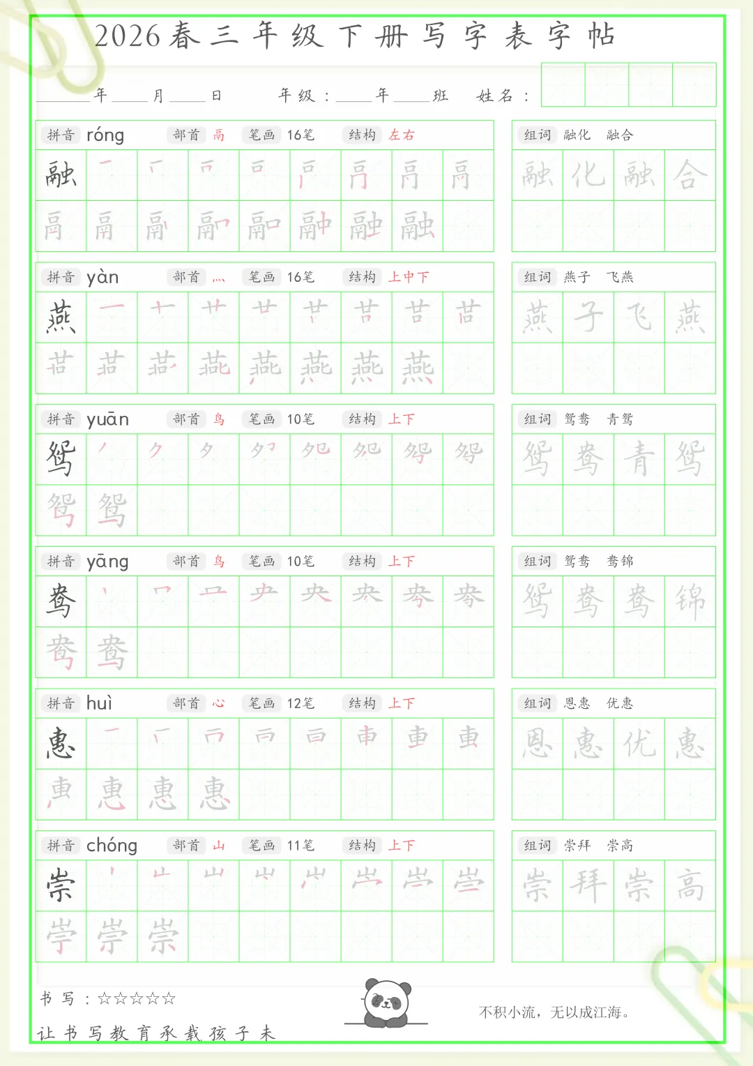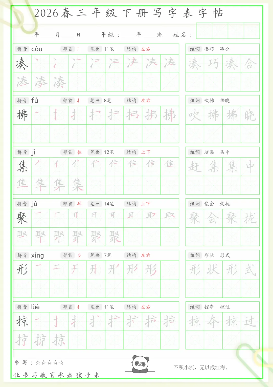 三年级下语文写字表笔顺组词字帖,电子版可打印