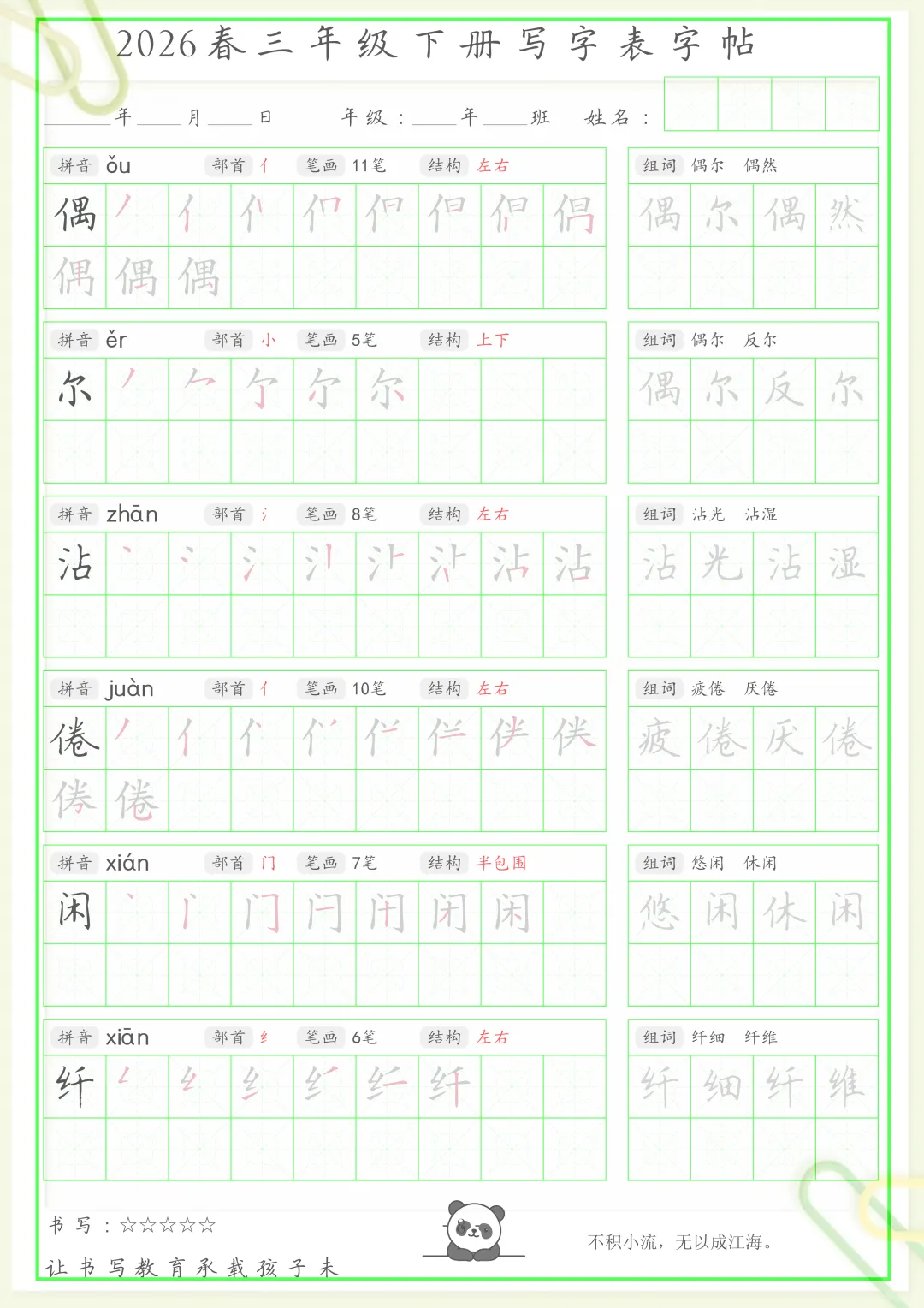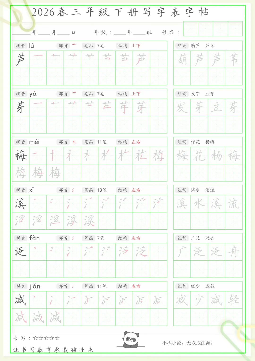 三年级下语文写字表笔顺组词字帖,共42页,电子版可下载可打印,内容紧扣三年级下册语文写字表学习要求,围绕生字笔顺练习、规范书写和组词巩固等内容展开,帮助孩子在边写边练中加深对字形、笔画和词语运用的掌握,更适合家长日常配合课内学习进行查漏补缺与书写训练,需要的家长可以及时下载打印出来,让孩子踏实练一练。