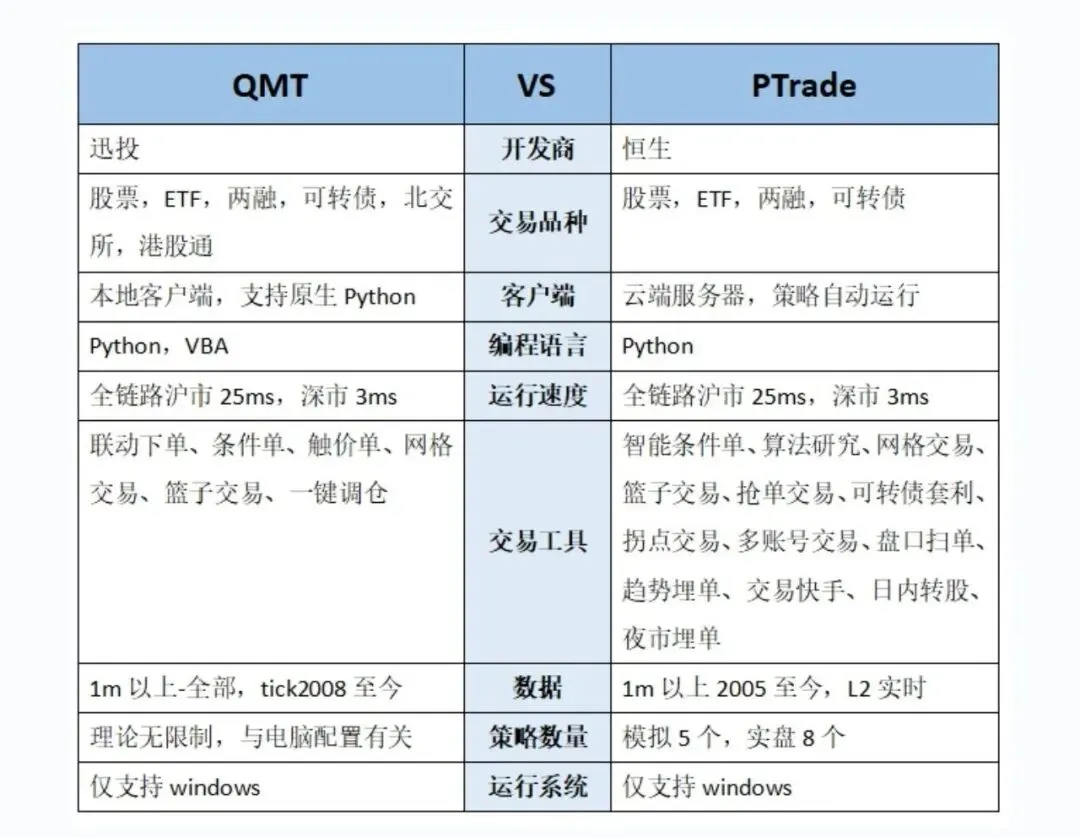 简单说,就是QMT只在你的电脑上运行,数据也在你的本地,电脑一关策略就不跑了,而PTrade数据在券商服务器,关了电脑策略也会继续运行。