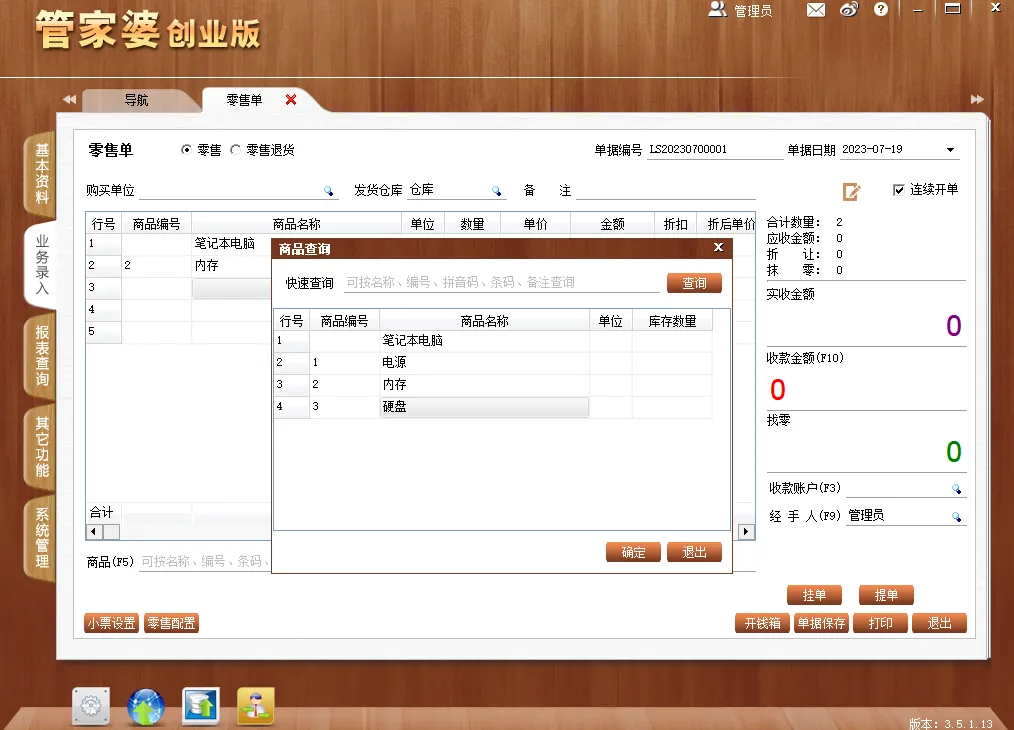 业务录入功能也比较简单,可以看到的非常清晰的功能,分为:销售单, 销售退货单, 零售单, 进货单, 进货退货单, 收款单, 付款单, 收入单, 支出单, 转账单, 经营历程, 调拨单, 其它入库单, 其它出库单功能。