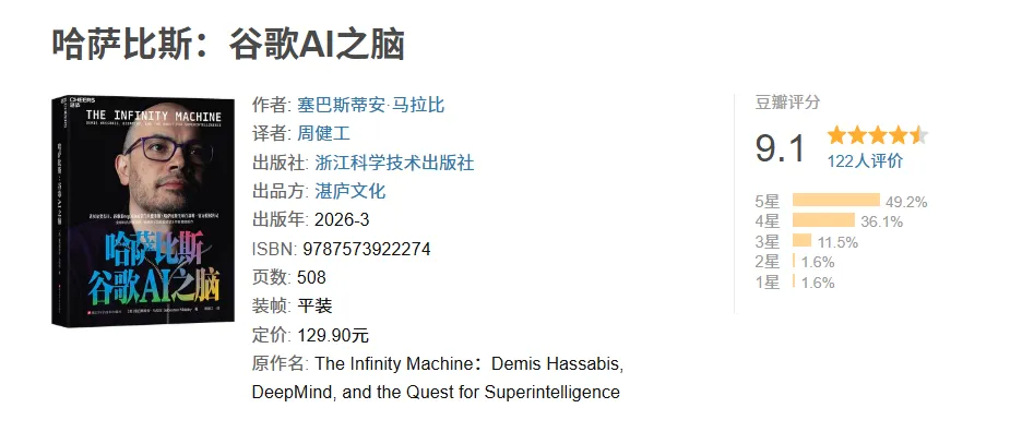 书名英文原意为《无限机器》(The Infinity Machine)。作者马拉比认为,哈萨比斯试图构建的AGI是一台能从无限数据中提炼规律的机器。对哈萨比斯而言,这不仅是一个技术产品,更是人类为了理解自身和宇宙而进行的最高努力。