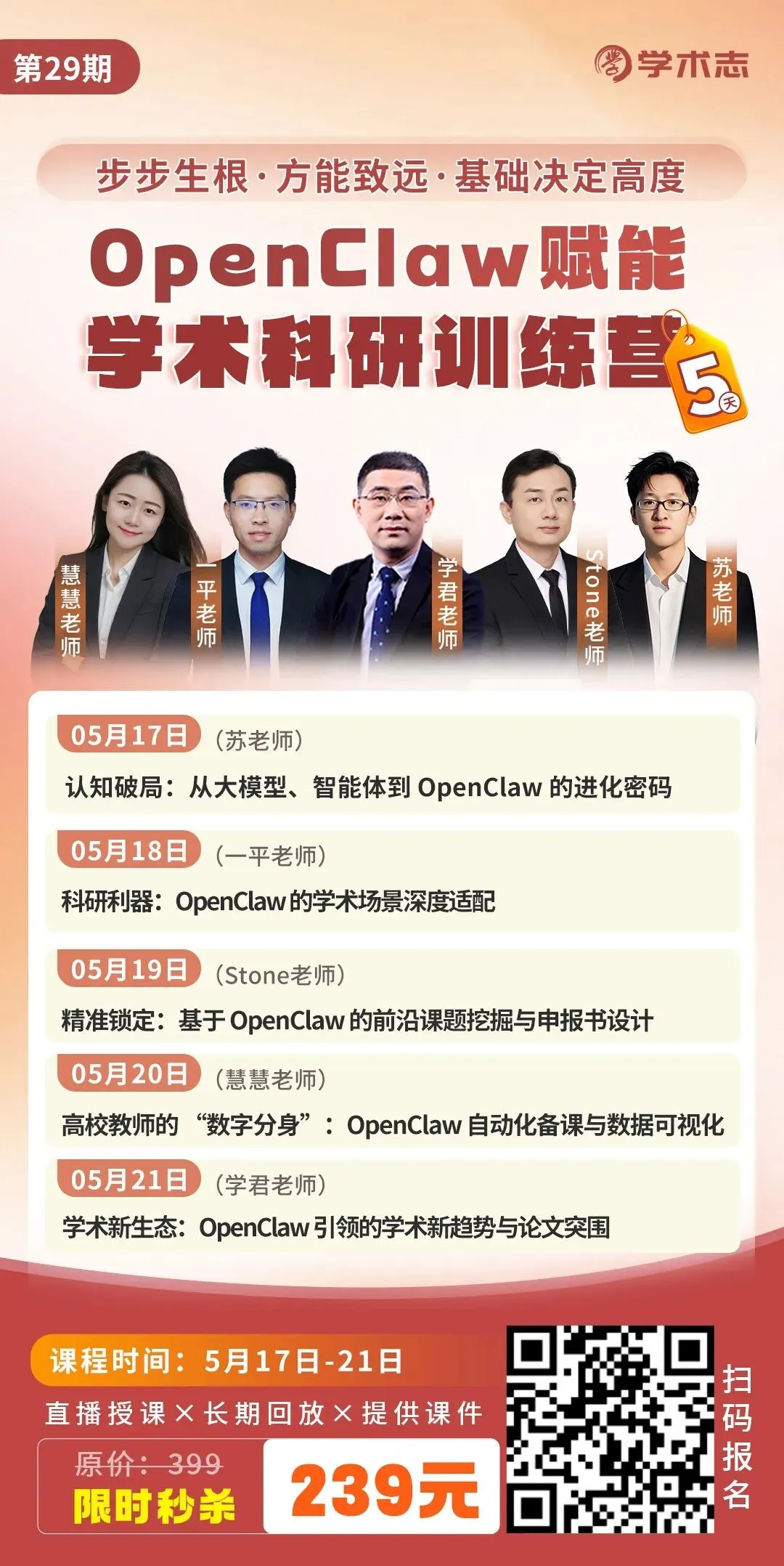 步步生根,方能致远。基础决定高度! 为了帮助广大硕博研究生、高校教师及科研工作者打破效率瓶颈,学术志重磅推出——【OpenClaw赋能学术科研训练营(第29期)】!