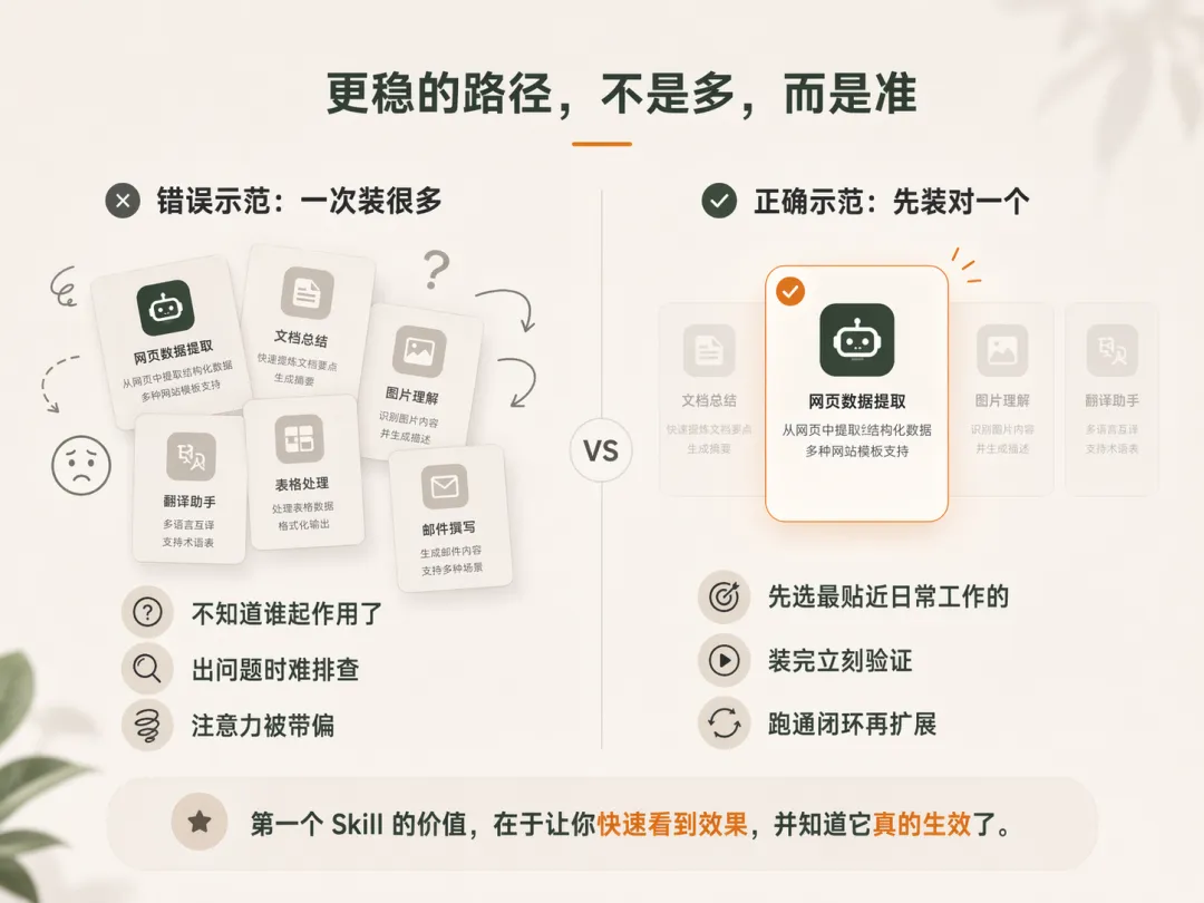 不是你装了多少 Skill,才决定它好不好用;而是你有没有先装对那个最贴近自己工作的第一个 Skill。
