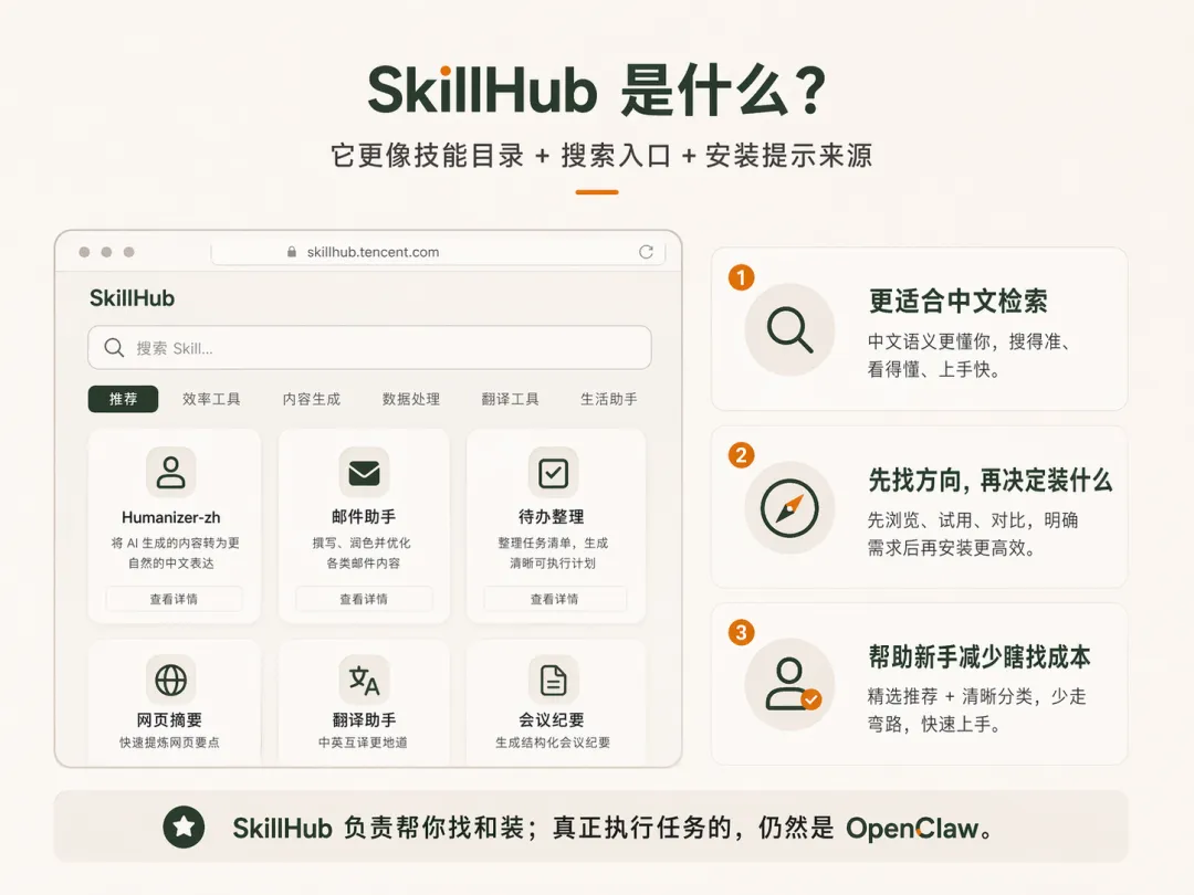如果把 OpenClaw 理解成“真正执行任务的那一端”,那 SkillHub 更像“先帮你找方向的那一端”。