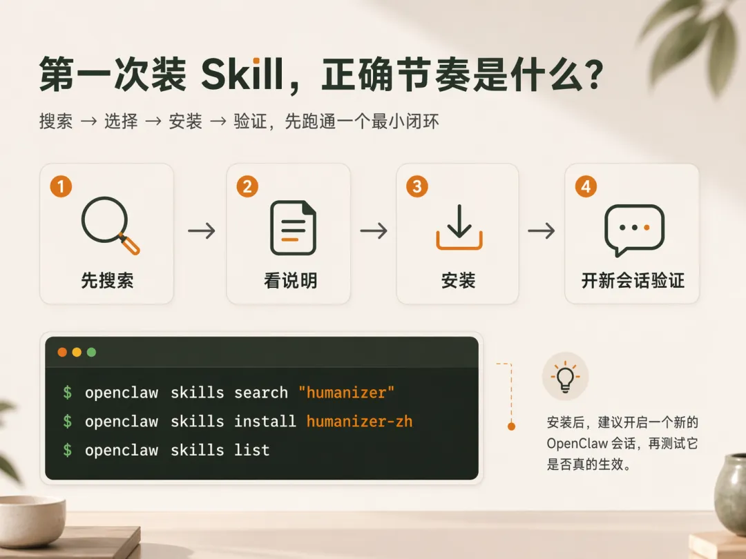 图 3:对新手最重要的,不是一下装很多,而是把“搜索 → 安装 → 新会话 → 验证”跑通。