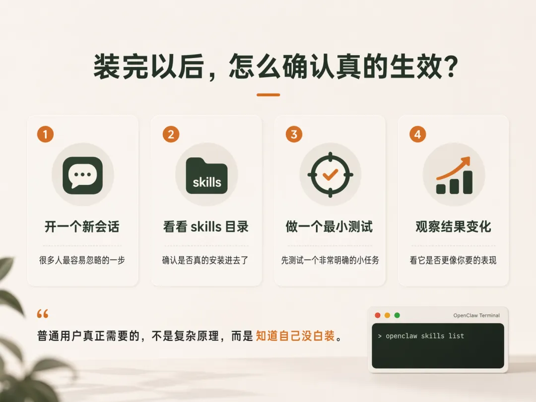 Q3:安装成功了,但感觉没变化怎么办?先开新会话,再看本地列表或目录,再做一个非常明确的小任务。