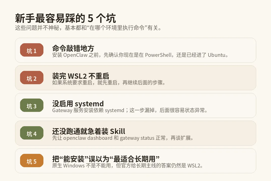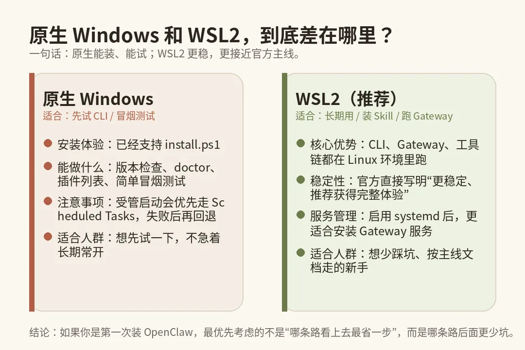 这句话很关键。它的意思不是“原生 Windows 完全不能用”,而是:你当然可以在 Windows 里做一些基础动作,但如果你想把 OpenClaw 当成长期可用的工具,而不是一次性的试验品,那么官方给出的主线答案仍然是 WSL2。