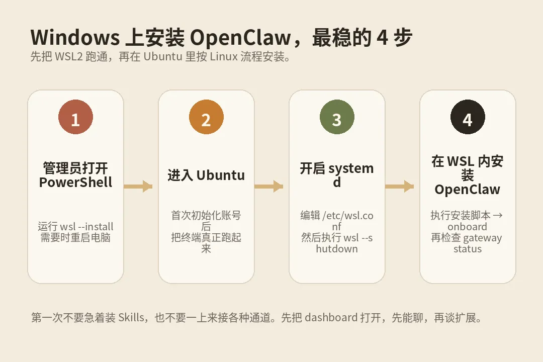 图 2:顺序不要乱。先有 WSL2,再开 systemd,最后才是 OpenClaw 本体。