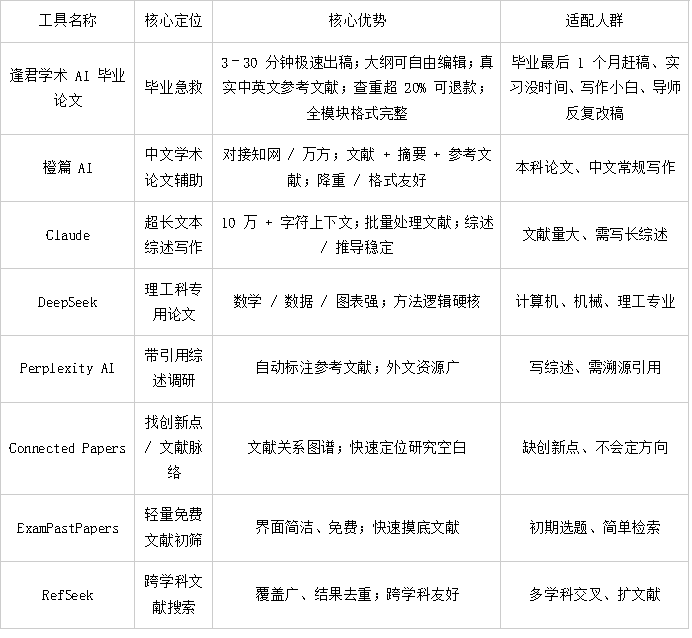 8款AI毕业论文工具核心功能总结表