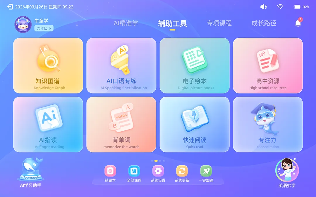 AI智能时代,教育的本质正被重新定义——从“千人一面”的知识灌输,走向“千人千面”的智慧赋能。牛童学学能成长中心以优质学习资源为根基,以先进AI学习机为核心载体,实现“学、练、测、考”各环节的无缝衔接与精准闭环,系统化地帮助学生查缺补漏、巩固提升。