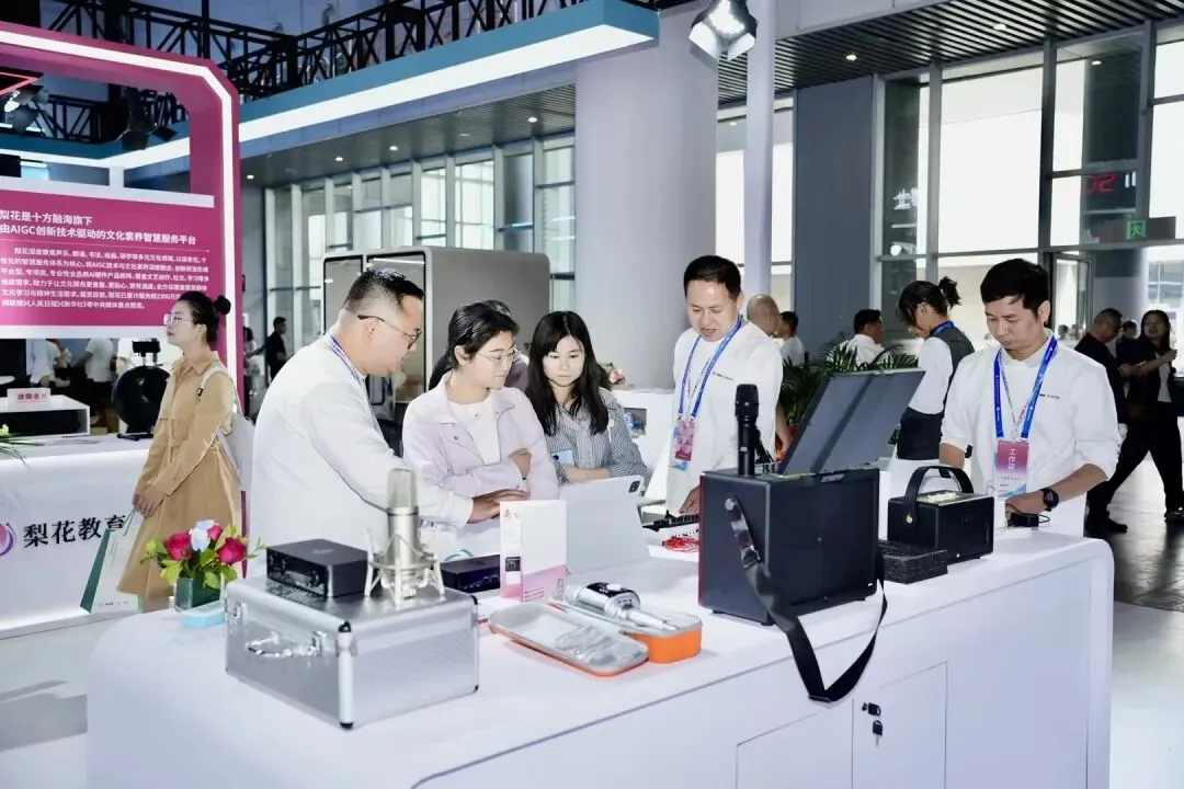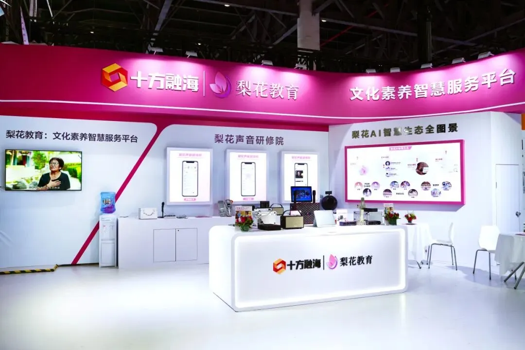 在主场馆,十方融海旗下文化素养智慧服务平台“梨花” 以72平方米特装展台集体展出8款AI声学硬件产品,按“1+2+3”生态矩阵陈设,分别对应乐龄用户入门学、场景练、专业创的成长路径。