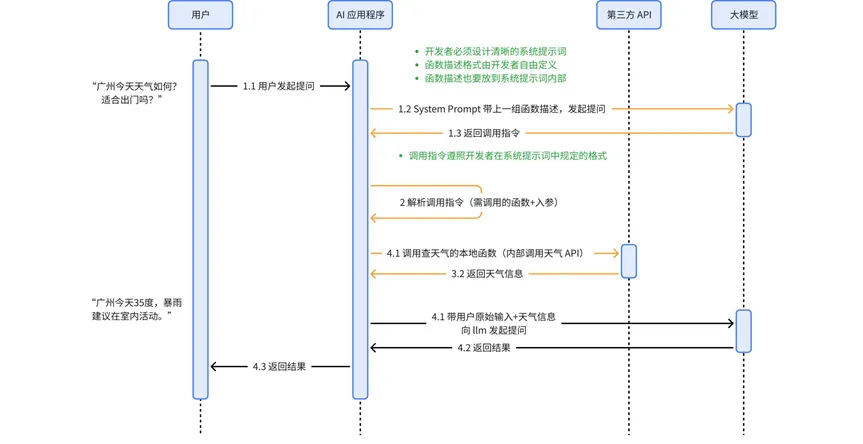机制: 让 LLM 按照约定 JSON Schema 输出“调用指令”,由外部系统(Host)执行具体操作(如查天气、发邮件)。