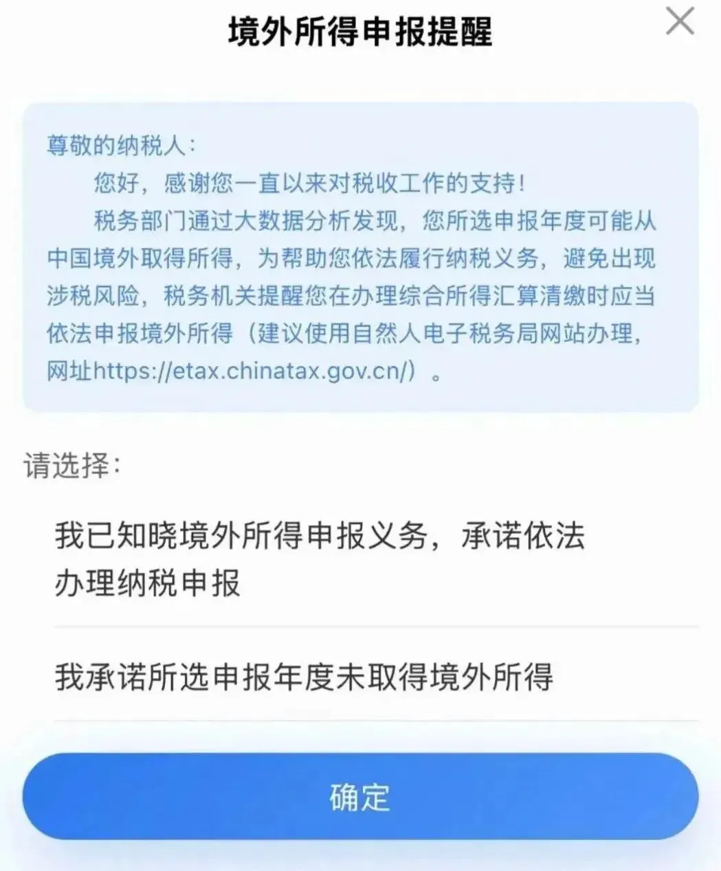 近期,不少纳税人反映,在登录个人所得税APP时收到了系统弹窗提醒:税务部门通过大数据分析发现其2025年度可能存在境外收入,要求依法主动申报。