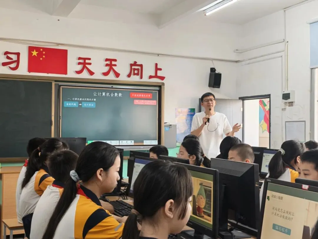 第一节课由泉州市中山陶英小学汤俊奇老师执教五年级《让计算机会数数》。课堂设计巧妙,逻辑清晰。导入环节别出心裁,利用学校吉祥物“陶陶”“英英”聊超算的AI视频,迅速点燃课堂气氛;全课以“陶陶”“英英”的对话情境贯穿始终,将抽象的循环结构学习转化为生动的互动挑战。课堂通过感知、探究、实践、迁移四大环节层层推进,并结合过程性观察与代码实现进行综合评价,在思维训练与结果达成中有效培养学生的计算思维,引导学生从“让计算机会数数”走向“用编程解决生活问题”。