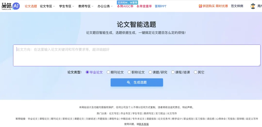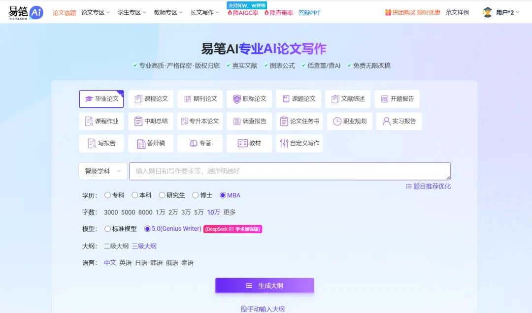易笔AI论文专注于高效AI论文写作,以简洁操作、实用功能为核心,在AI写论文、AI论文写作、论文AI生成环节展现出强劲实用性,是追求高效写作、便捷操作的学术人群的日常学术写作得力帮手。这款产品聚焦学术写作核心痛点,打造免费选题、三级大纲免费生成与专业降重三大核心功能,同时拓展多语种写作能力,覆盖基础到进阶的各类AI写论文场景,让用户无需复杂操作就能快速完成论文AI生成和AI写论文创作与优化,大幅缩短论文写作周期。