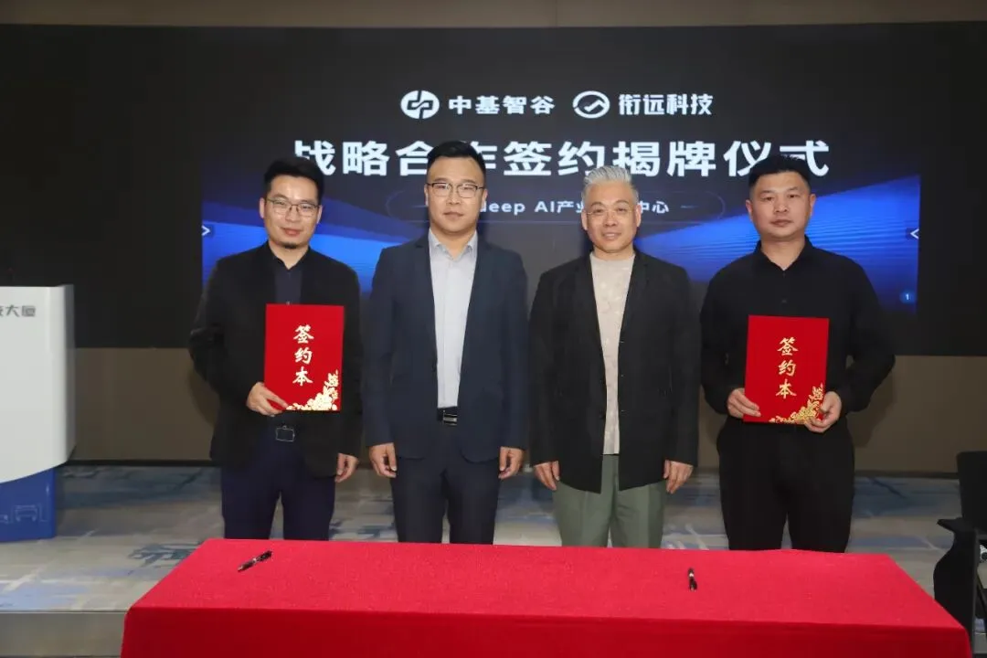 衔远科技联合创始人兼CEO任成元与中基智谷集团董事长于占岐共同见签,衔远科技副总裁、创新事业部总经理刘玉杰与中基智谷总经理祁惠宇代表双方签约。