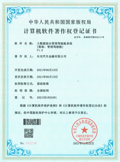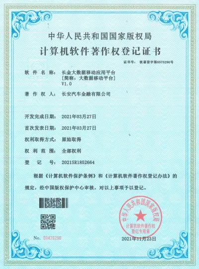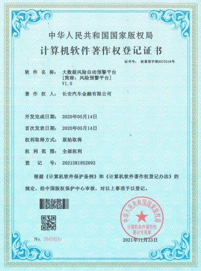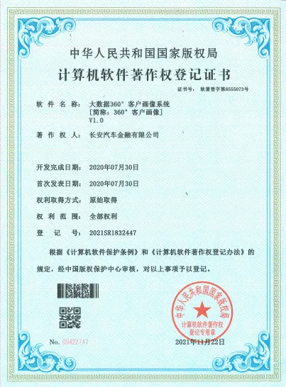 公司自主研发的《大数据360°客户画像系统》、《大数据风险自动预警平台》、《大数据服务能力平台》等5项软件获得国家版权局授予的计算机软件著作权登记证书。