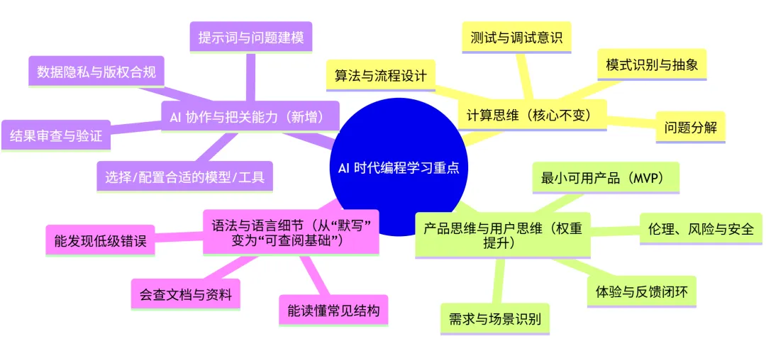 以前学编程,80%的时间在学语法(变量、循环、函数)。现在,这些通通要让位给“程序控制技能”:了解各类编程概念、调试、测试、判断AI的结果、描述错误、修改、运行、能看懂、部署、架构、判断力……